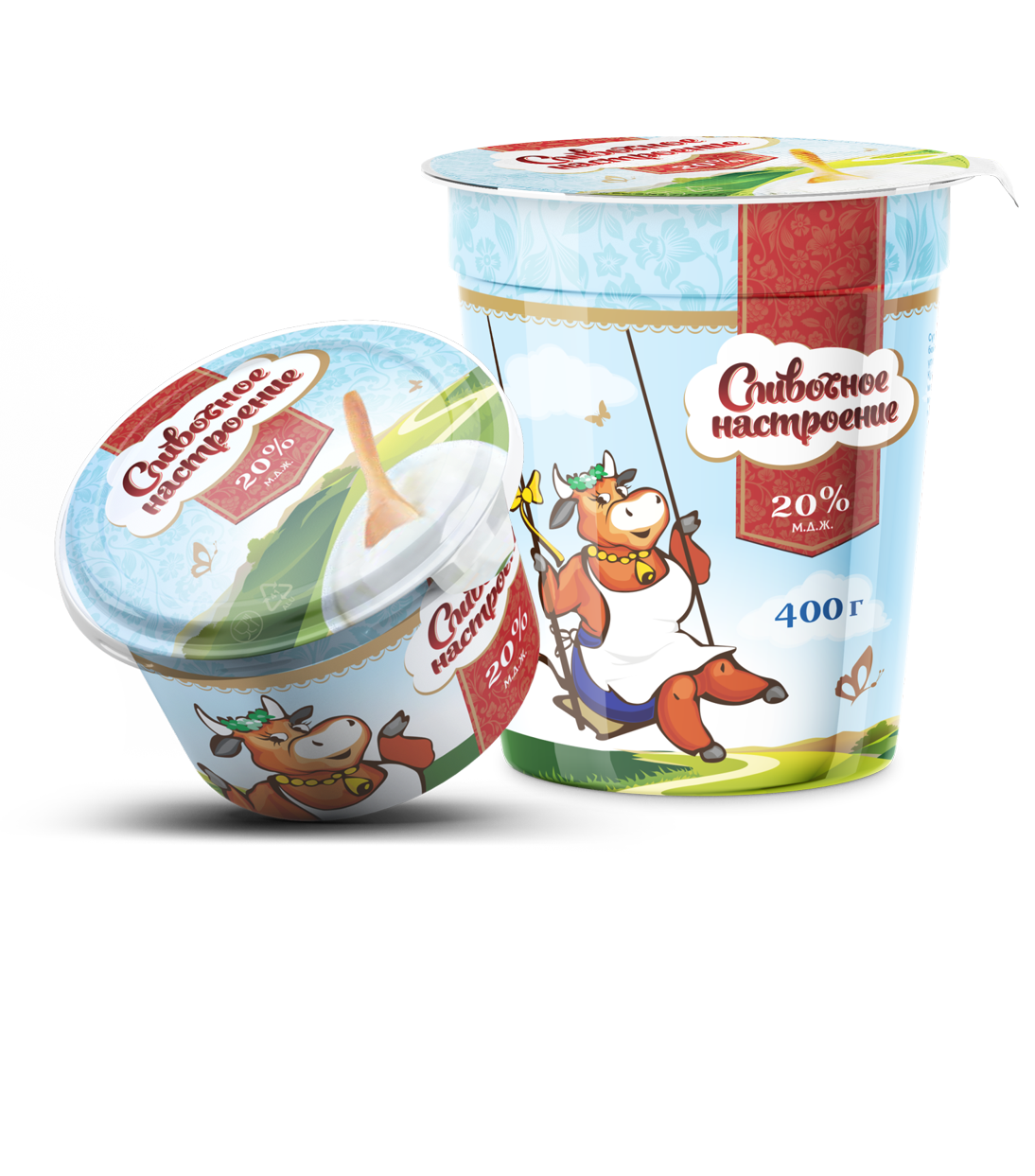 "Сливочное настроение" - это линейка молочной и масло-жировой продукции, в удобной и яркой упаковке, а главное по доступным ценам. Уже сейчас вы можете увидеть на полке спред, топленую смесь, а также сметанный продукт и творожный продукт. Упаковка отличается красочностью, русскими узорами и привлекательным персонажем - коровушкой. Корова на качелях - персонаж, который любим и узнаваем нашими потребителям, именно она и стала основой при разработке нового дизайна.